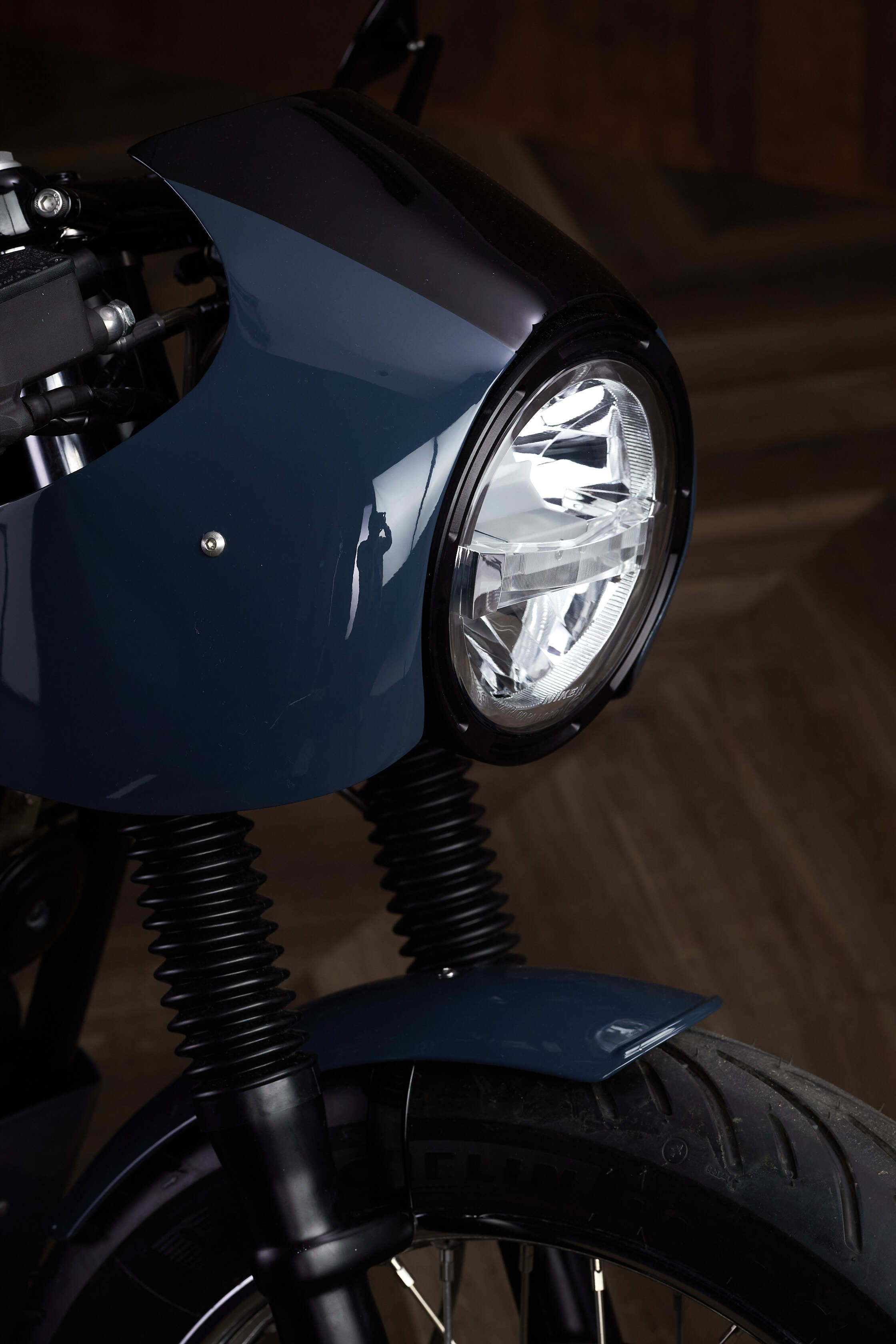 Damit der Look passt, wurde die Gabel geschwärzt und das vordere Schutzblech gekürzt. Ein kleiner Bellypan verdeckt geschickt den unteren